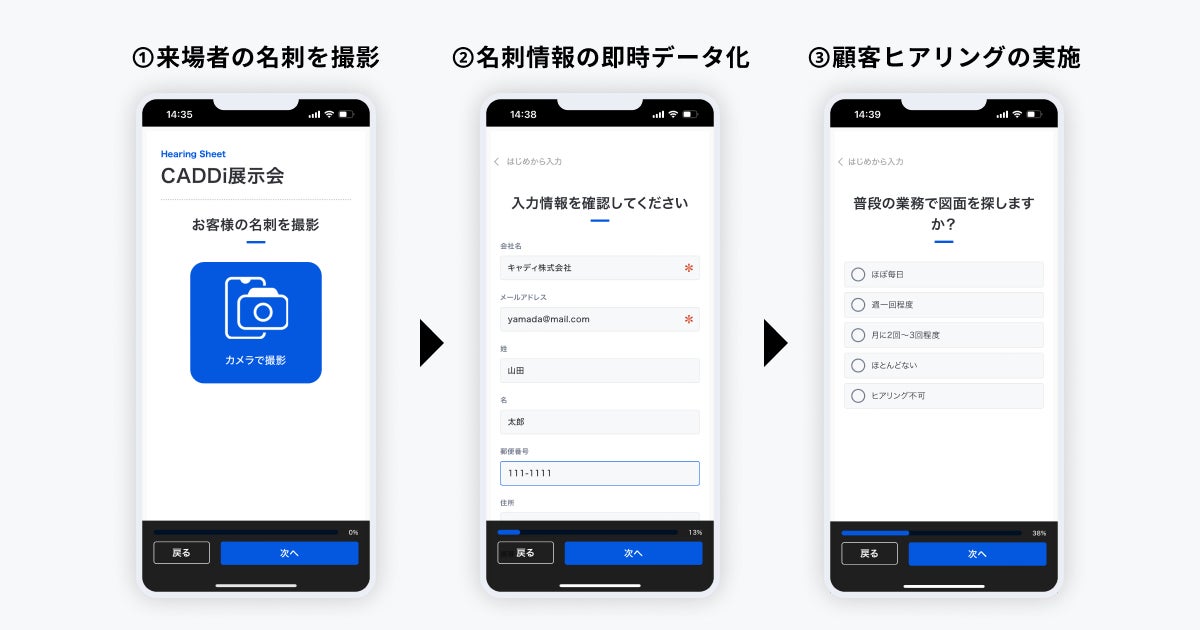 キャディでは、展示会出展時の来場者への顧客ヒアリングを紙のヒアリングシートを用いて行っていました。そのため、来場者情報とヒアリング内容の紐付けやデータ化に時間と工数を要しており、展示会での接点から営業活動までに最大5日、最短でも1日のリードタイムが発生していました。
