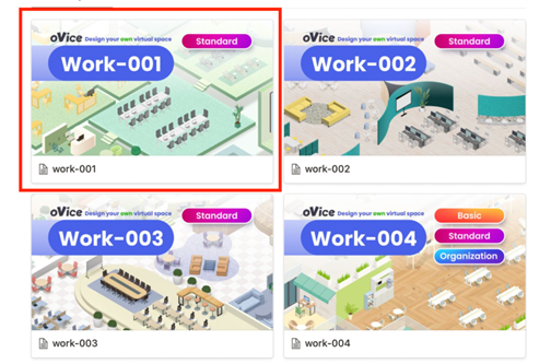 複数のレイアウトから1つ選び、「セルフリフォーム」できる。赤い四角で囲まれているのはオフィスをイメージした、200人同時アクセス可能なStandardサイズのレイアウト。