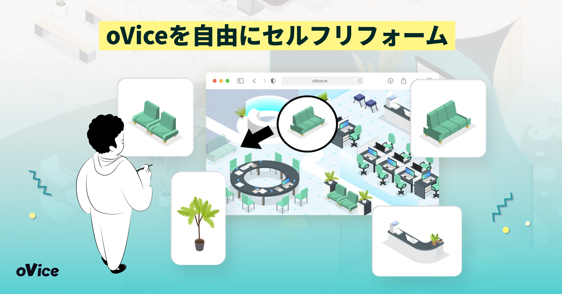 バーチャル空間「oVice」は2020年8月のサービスリリース以降、オフィスやイベント会場など、さまざまな場面で活用されてきました。それぞれのニーズに対応できるよう、約500種類の空間レイアウトを用意してきましたが、「利用人数やシーンにあわせてもっと手軽にカスタマイズしたい」との声を受け、この度「セルフリフォーム」機能を提供することとしました。