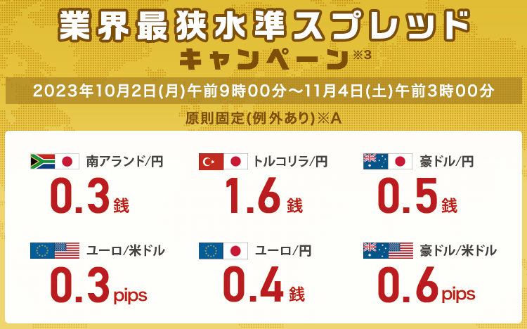 ※3 「業界最狭水準スプレッドキャンペーン」スプレッド(対象期間:2023年10月2日(月)午前9時00分~2023年11月4日(土)午前3時00分、提示時間帯:対象期間中の各営業日午前9時~翌午前3時)