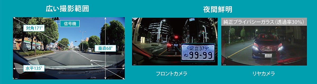・対角171°の広角撮影で信号機や隣車線をカバーし、広画角と高画質を両立。ナンバープレートまでしっかりと記録できる安心感にこだわりました。
