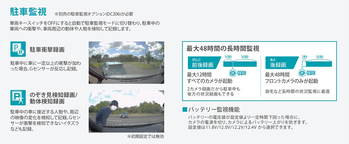 ・停車時に後方車両の接近を検知して警告・録画。信号待ちでの追突など、衝撃センサーが反応しない程度の弱い接触も検知