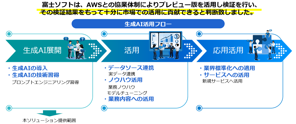 富士ソフト株式会社は、アマゾン ウェブ サービス(AWS)の生成系AIサービスである「Amazon Bedrock」の活用を促進する「Amazon Bedrock 導入ソリューション」を提供開始いたします。まずは、「導入サービス」と「教育サービス」をご用意し、Amazon Bedrock 導入から使用方法の習得までをサポートいたします。今後、サーチエンジンと組み合わせた検索拡張生成(RAG)など、様々なサービス拡充を図り生成系AIの発展に貢献いたします。本サービスは、富士ソフトがプレビュー期間からいち早く事前検証した結果と、AI関連のノウハウを活用した独自の技術で実現しています。