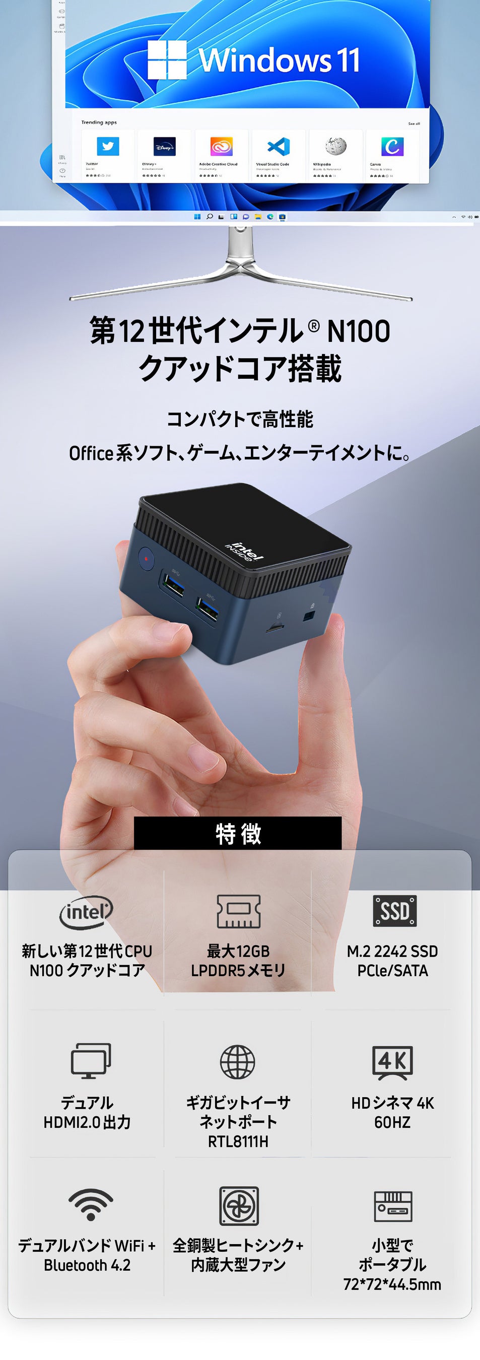 【Windows 11 Pro/Intel Celeron 4コア 最大2.70GHz/WiFi 6/Bluetooth 5.2/ギガビット・イーサネット/USB3.0×4、HDMI×2】