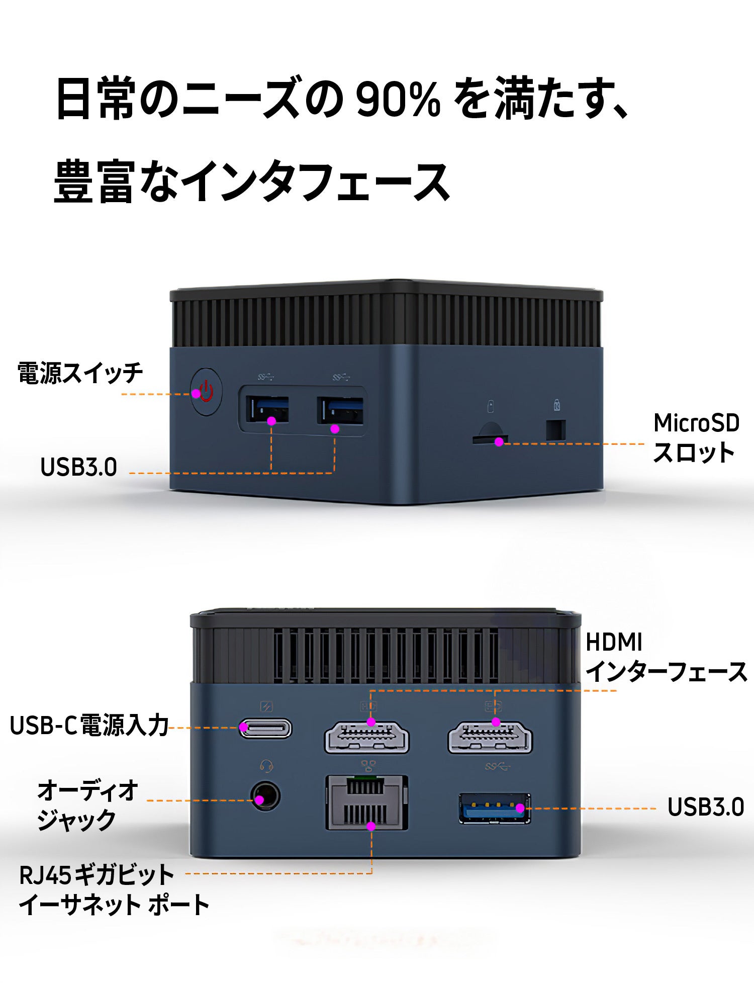 ・豊富なインタフェース(USB3.0*3、HDMI2.0*2、Type-C電源*1、オーディオジャック×1、Micro SDカードスロット×1、ギガビットLAN×1)