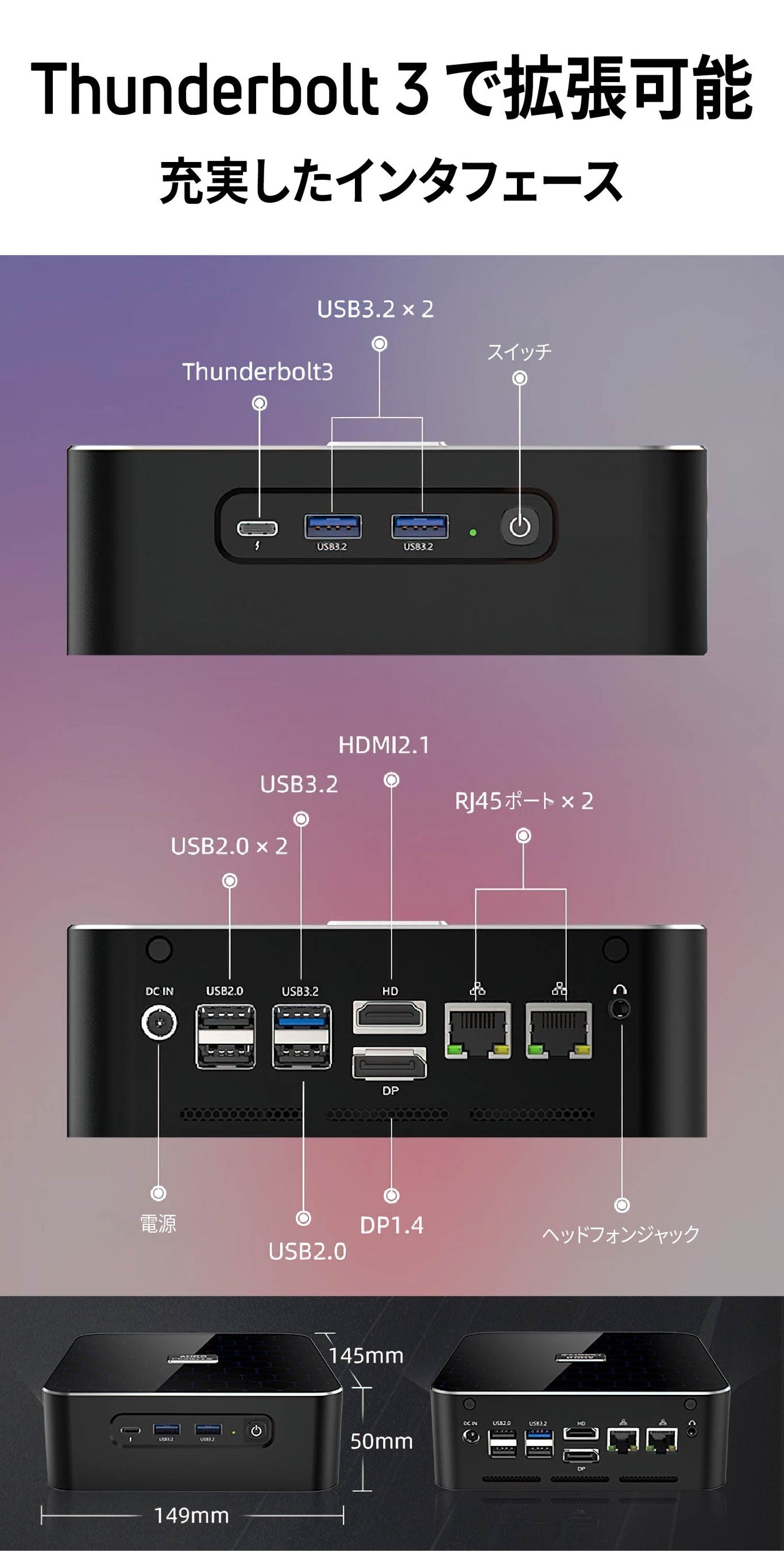 【Windows 11 Pro/ターボ周波数5.2GHz/高速なDDR5メモリー/WiFi 6E、Bluetooth 5.2、ギガビットイーサネット/豊富なインタフェースThunderbolt 3、USB2.0x3、USB3.2×3、HDMI2.1、DP4.1、RJ45x2】
