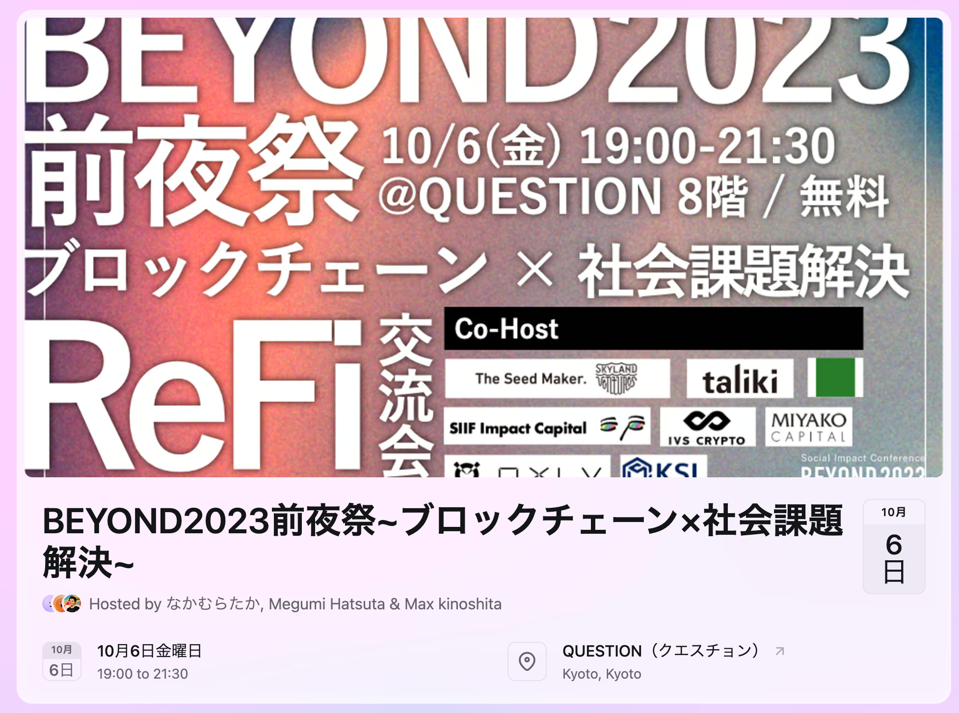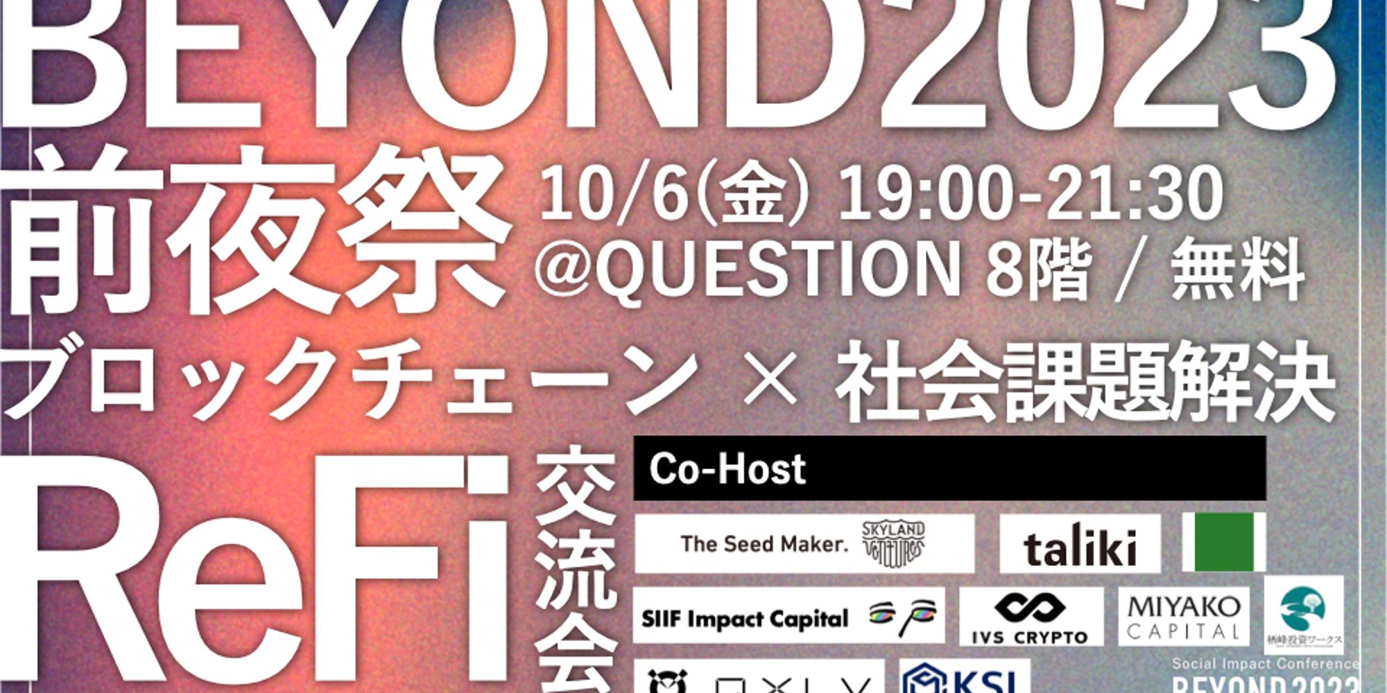 BEYOND 2023の前日に、10月6日(金)19:00より前夜祭の開催が決定しました。グリーンダオも多数のホストと共に共催として参画させていただいています。当日は交流会に加えて、ReFiに関するパネルディスカッションも開催予定です。スポンサー様のご提供によりドリンク付参加費無料のイベントですので、ご都合あう方はぜひお気軽にご参加ください!!