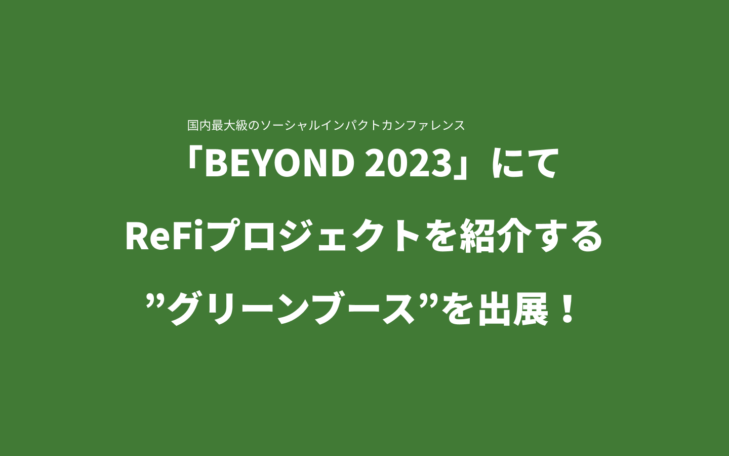 「グリーンブース」はReFiの概要とユースケースとして国内を中心とした様々なReFiプロジェクトを紹介するブースです。この度、2023年10月7日に開催される国内最大級のソーシャルインパクトカンファレンス「BEYOND 2023」に出展することが決定しました。