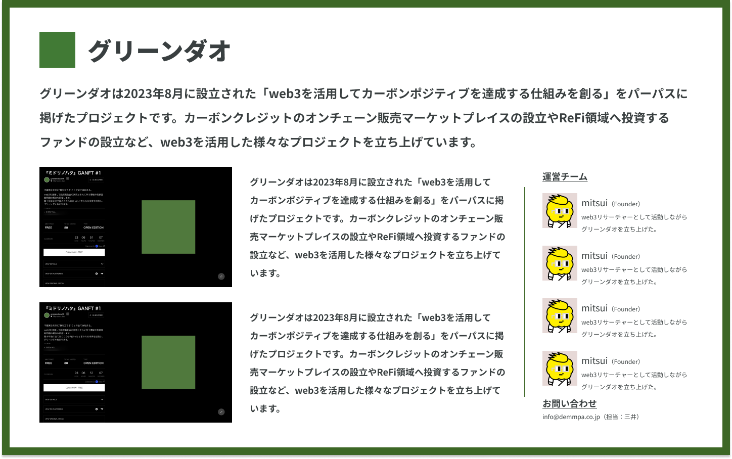 グリーンダオはweb3(ブロックチェーン)を活用してカーボンニュートラルを実現する仕組みを構築することを目的としたプロジェクトです。カーボンクレジットのオンチェーン販売を目指す「グリーンマーケット」の他にも、ReFiプロジェクトへの投資を行う「グリーンファンド」、環境に良い行動へのリターンを促す「グリーントークン」の開発及び運営を準備しています。