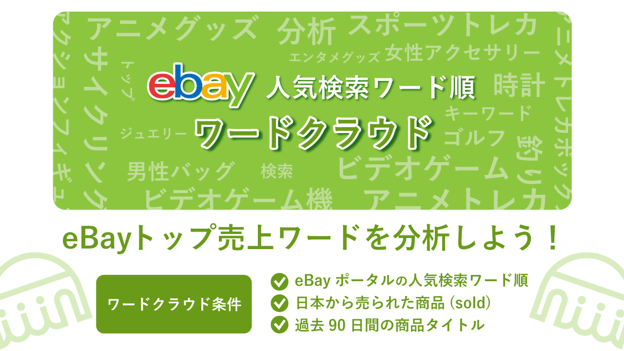 eBayポータルで公開されている人気検索キーワード順に日本から売られた商品のタイトルをワードクラウド化。