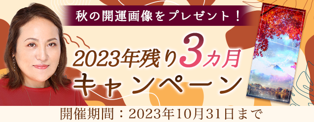 『2023年残り3ヵ月キャンペーン』では、あなたが2023年を幸せに締めくくり気持ちよく新年のスタートを切れるよう、2023年残り3ヵ月の運気をアップさせる「秋の開運画像」をご用致しました。キャンペーン対象鑑定を占って頂くと開運画像をGETできます。ぜひ、この機会に大串ノリコの占いであなたの運気を上げていきましょう!