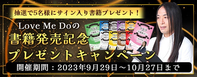 有名人の電撃婚や世界的なビッグニュースの予言を的中させて大人気の占い師Love Me Doの公式サイト『Love Me Do◆絶対数』では、『書籍発売記念プレゼントキャンペーン』を開催いたします。キャンペーンにご参加いただいた方の中から、抽選で5名様に直筆サイン入り新書籍「Love Me Doの月と龍が導く守護龍占い 2024」をプレゼント!