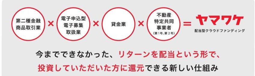 「ヤマワケ」は、第二種金融商品取引業※の登録をしているWeCapital社が運営することで、クラウドファンディングを通じて出資した事業者の業績が上がる場合には「リターンを配当する」という形で投資家様へ還元することができ、将来的には不動産以外の様々な商品も証券化することを目指す、新しい仕組みを持ったプラットフォームです。