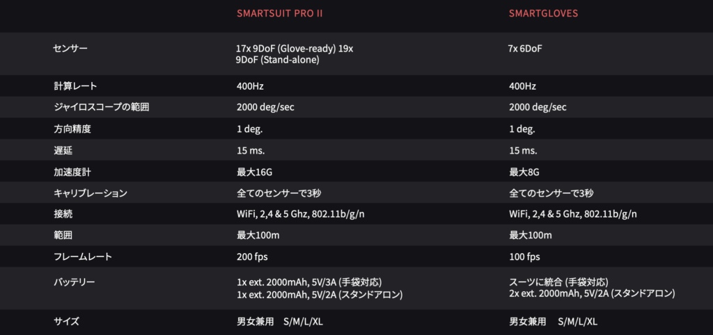ROKOKOは、モーションキャプチャー初心者向けのエントリー製品から、企業向けの高精度製品まで幅広く取り揃えています。また他社製品との連携も柔軟に対応しています。現時点でのROKOKOスーツの機能やスペックは以下の通りです。