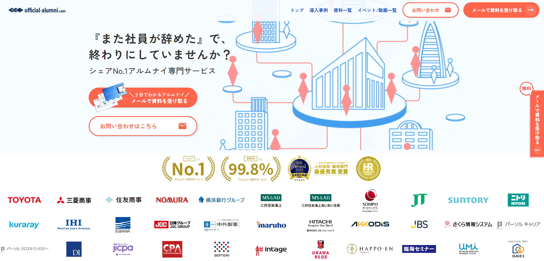 ハッカズークが提供する『Official-Alumni.com』は、シェアNo.1(*)のアルムナイ専門サービスです。企業とアルムナイ、アルムナイ同士が繋がることができるクラウドサービスとともに、豊富な知見を基にしたコンサルティング及び運用支援を提供しています。アルムナイ採用やビジネス協業、離職率改善など、さまざまな価値を生み出します。