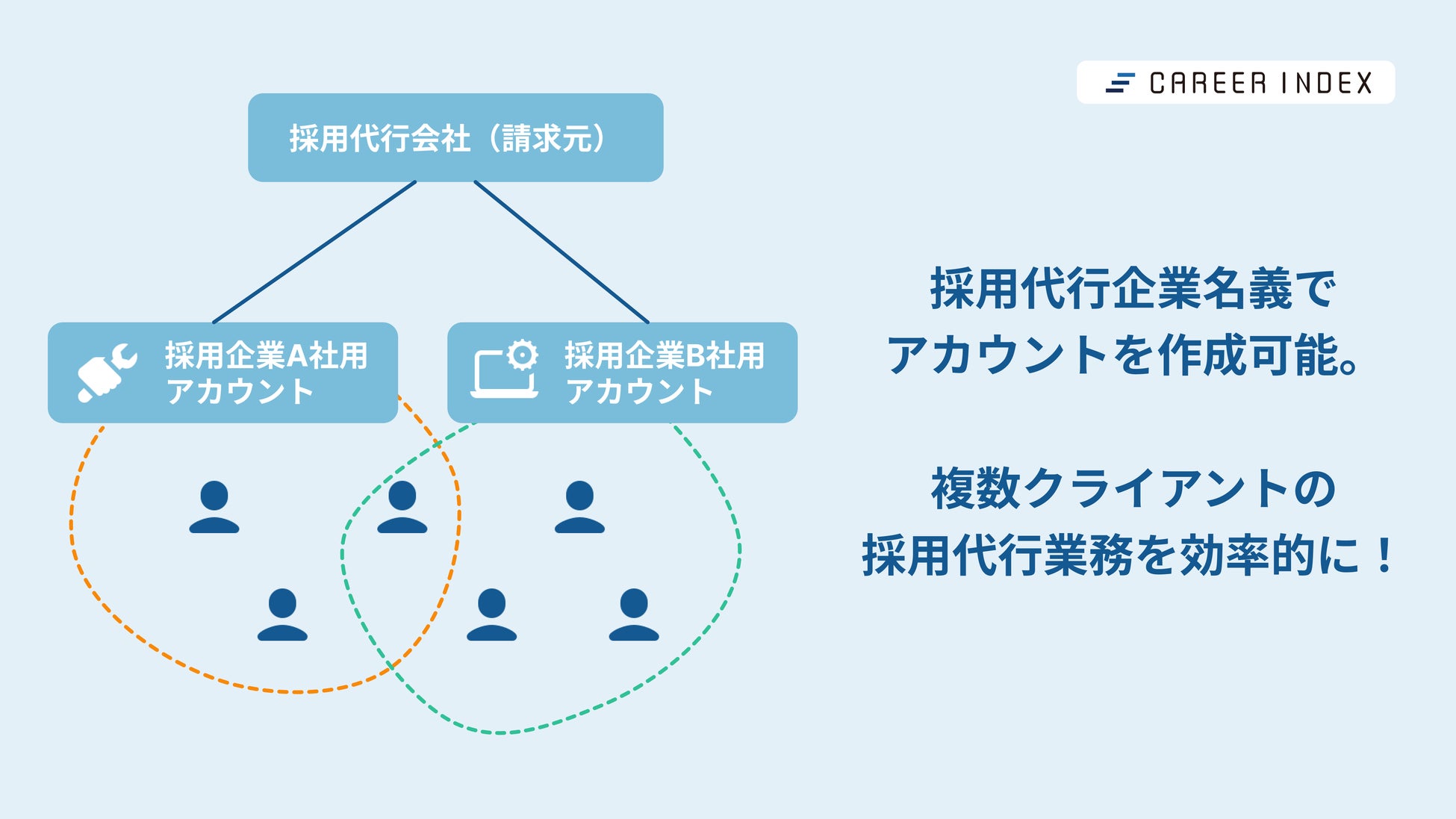 スカウトサービスは採用に効果的である反面、求人企業の人事担当者は、面接の実施や内定者フォローなどの業務に追われ、スカウトサービスを利用する工数が確保できていない企業も少なくありません。このため、人事担当者に代わり、スカウトに伴う業務の一部を代行する企業の数が近年増加傾向にあります。一般的なスカウトサービスにおいては、スカウト代行企業は採用企業名義でアカウントを作成する必要があるため、複数のアカウントを管理する必要があり、また、スカウト配信を代行する企業毎にログインをし直す必要があります。一方、「CAREER INDEXスカウト」では、一つのアカウントで複数の企業のスカウトが配信できる設計としました。スカウト代行企業は、自社名義でアカウントを作成し、当該アカウントにて、複数クライアントのスカウト代行業務を効率的に行うことが可能です。