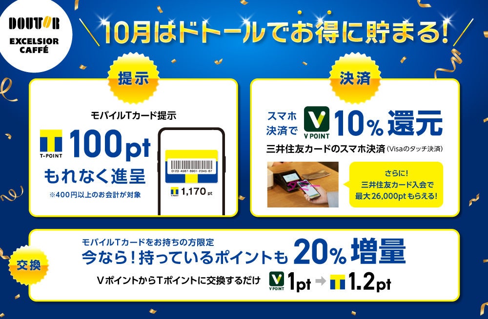 【提示】では、「ドトールコーヒーグループ」対象店舗のお会計時に「モバイルTカード」のご提示で、もれなくTポイント100ポイントを進呈いたします。また【決済】では、「ドトールコーヒーショップ」「エクセルシオール カフェ」を対象に「三井住友カード」もしくは「Vポイントアプリ」のスマホ決済でお支払いをいただくと、お会計金額の10%を還元いたします。