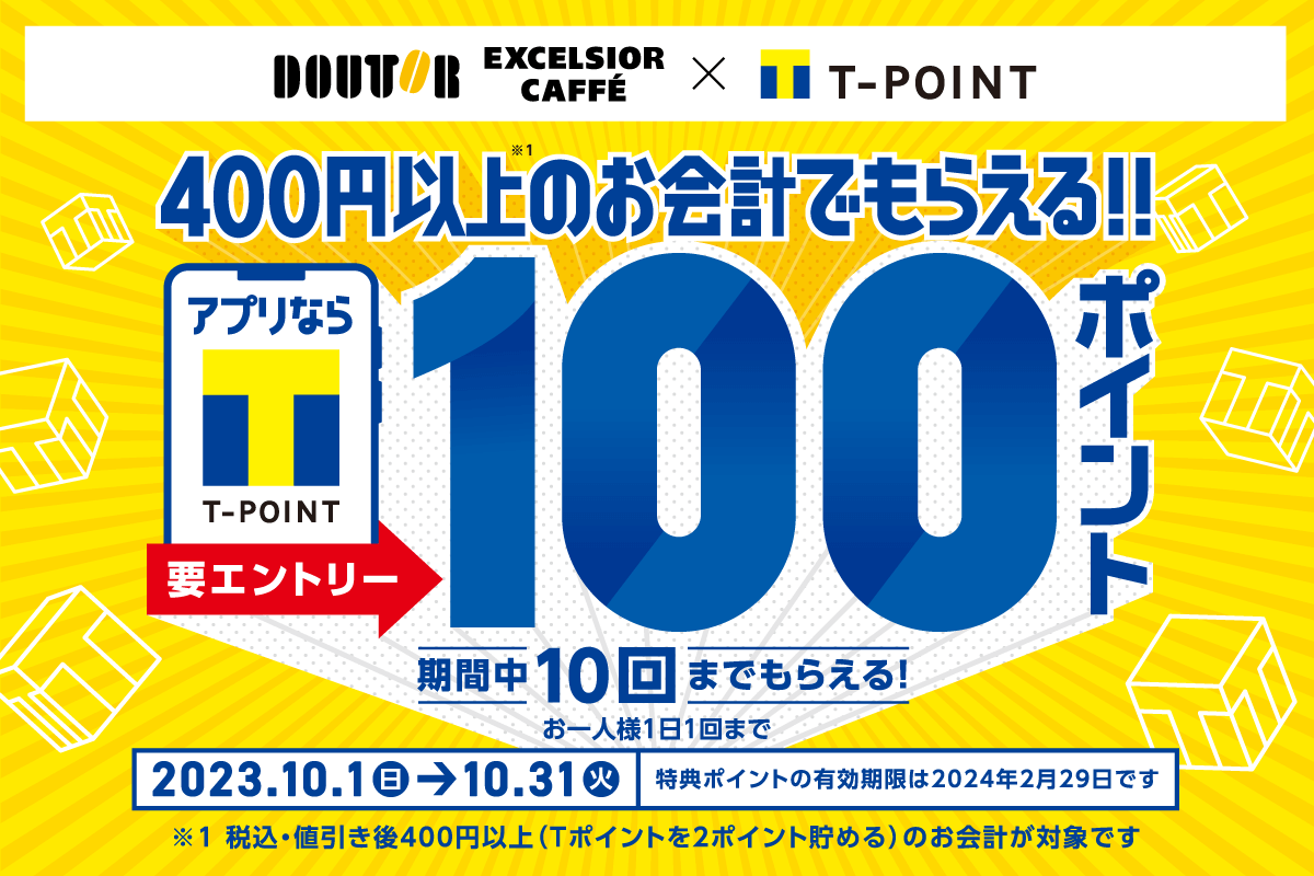 【提示】では、「ドトールコーヒーグループ」対象店舗のお会計時に「モバイルTカード」のご提示で、もれなくTポイント100ポイントを進呈いたします。また【決済】では、「ドトールコーヒーショップ」「エクセルシオール カフェ」を対象に「三井住友カード」もしくは「Vポイントアプリ」のスマホ決済でお支払いをいただくと、お会計金額の10%を還元いたします。