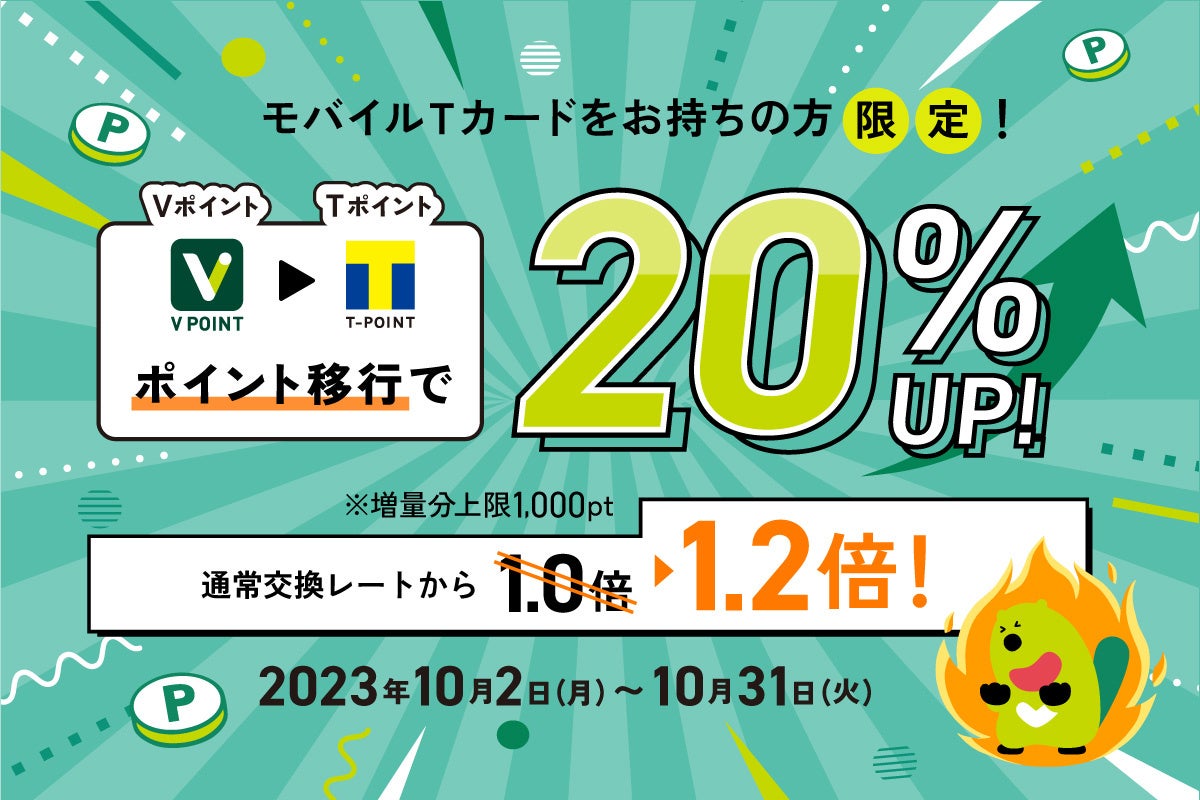 さらに期間中、VポイントをTポイントに交換すると、20%増量になるキャンペーンも実施中!(増量分上限1,000ポイント)