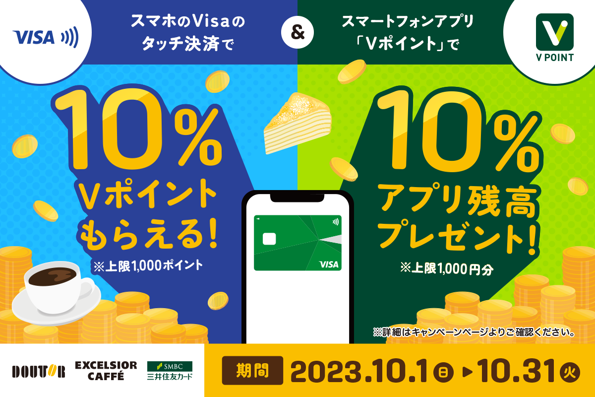 キャンペーン期間中、対象店舗にてスマホ決済(Visa)をすると、ご利用額(税込)の10%分のポイント還元がされます(エントリー不要)