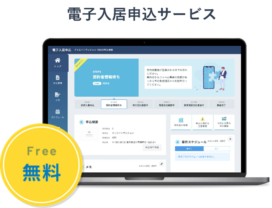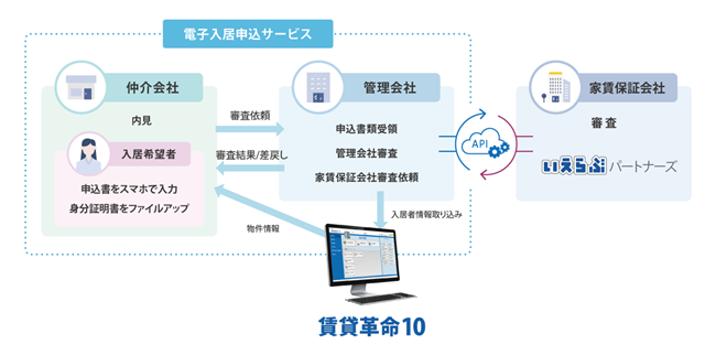 電子入居申込サービスは、日本情報クリエイトが不動産会社に向けて提供する無料のサービスであり、導入することで入居申込のやり取りのほとんどをオンラインで完結させることができます。また、クラウド型の賃貸物件総合管理システム「賃貸革命10」と一緒にご利用いただくことで、物件情報や入居者情報等の共通のデータが連携し、作業担当者はより広い範囲での業務効率化が実現します。