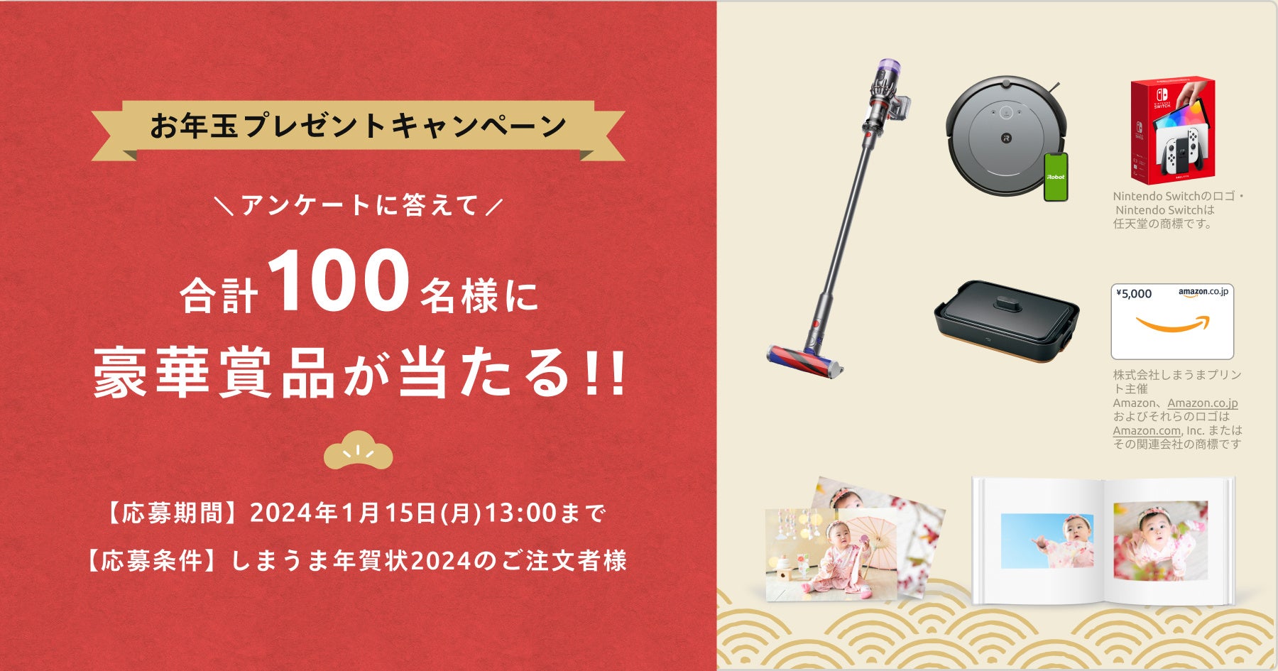 キャンペーン期間中、「しまうま年賀状2024」で年賀状・喪中はがき・寒中見舞いのいずれかを注文してご応募いただいた方の中から抽選でプレゼントいたします。さらに、はずれた方の中からも抽選でしまうまプリントの選べるクーポン「写真プリントorフォトブック(1,000円分)」が当たるダブルチャンスもご用意!