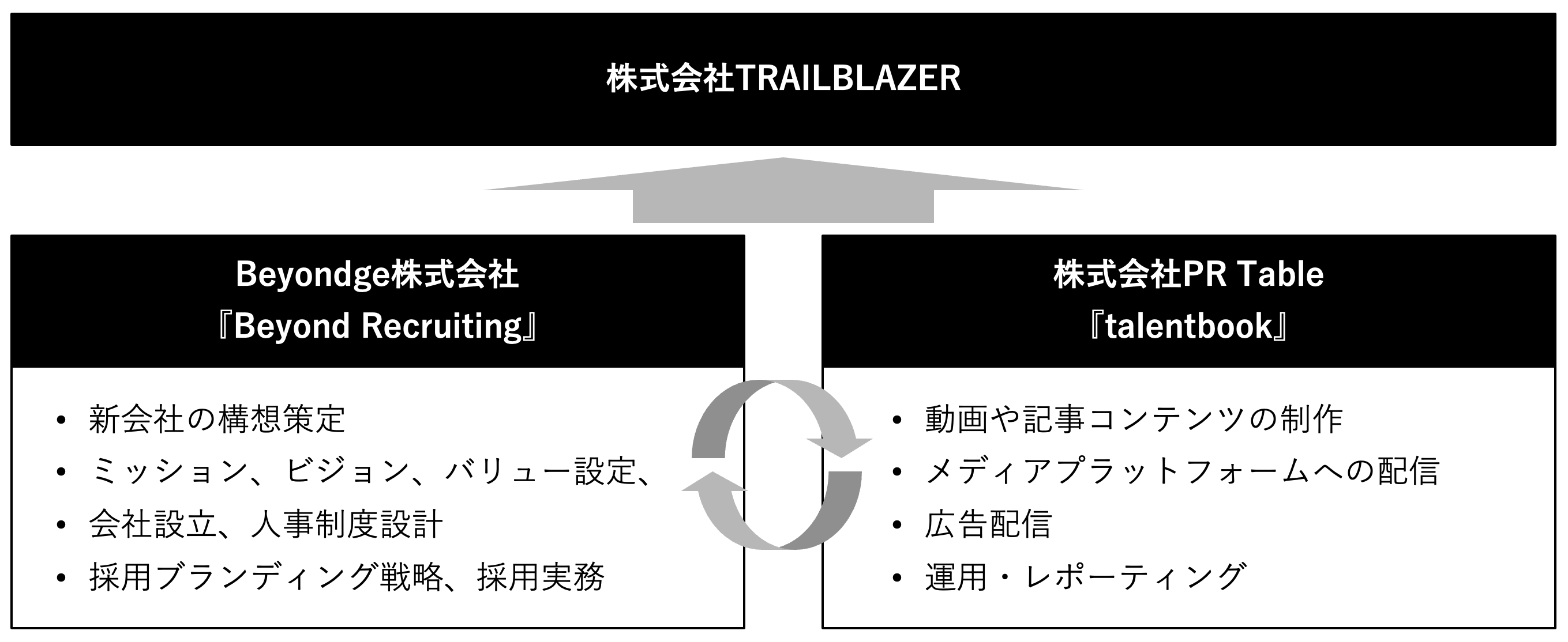 本取り組みでは、Beyondgeの展開する採用候補者の体験をベースに採用力を高める「Beyond Recruiting」サービスを採用しており、新会社の構想策定から、ミッション、ビジョン、バリューの設定、会社設立、採用ブランディング戦略、採用実務まで一貫して支援しています。PR Tableは、Beyondgeと連携して、動画や記事コンテンツの制作、メディアプラットフォームへの配信、広告配信・運用面で支援しています。