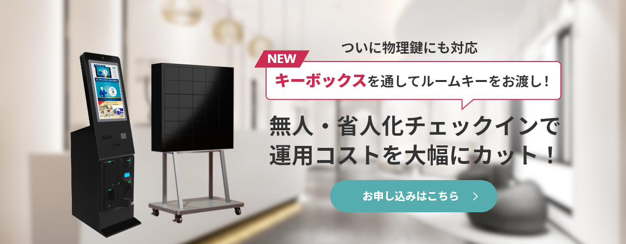 驚くほどの低コストで導入でき、現在ご利用中のPMSとのスムーズな連携(※一部例外があるので、詳細はお問い合わせください)を可能にします。さらにドアや鍵の交換無しでご利用のルームキーの種類に合わせたスマートチェックインの機種をご用意しております。