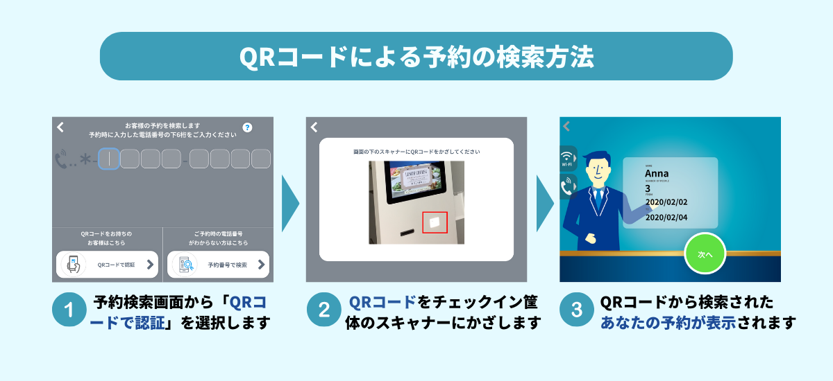 今後は、チェックイン時に予約番号や電話番号の入力は不要となり、予約時に発行されるQRコードを使用してチェックイン時の予約検索が可能となります。