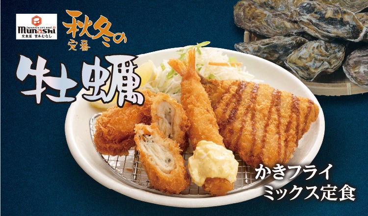 カキフライ2個と海老フライ・アジフライがセットになった「かきフライミックス定食」も同時販売いたします。