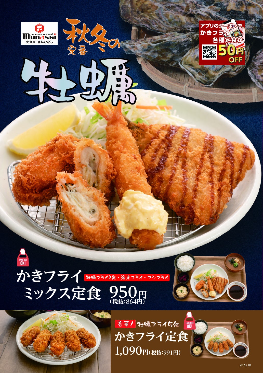 宮本むなし公式アプリでは「かきフライ各種定食50円引き」クーポンを配信いたします。