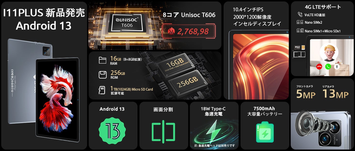 Android13 タブレット&大容量16GRAM (8+8㎇ 仮想) +256GBストレージ