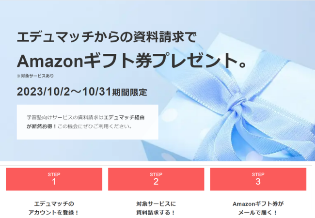 リニューアル記念キャンペーンとして、期間限定で特定のサービス資料を請求すると、Amazonギフト券1000円分をプレゼントします。この機会にぜひ、新しい「エデュマッチ」をご利用ください。