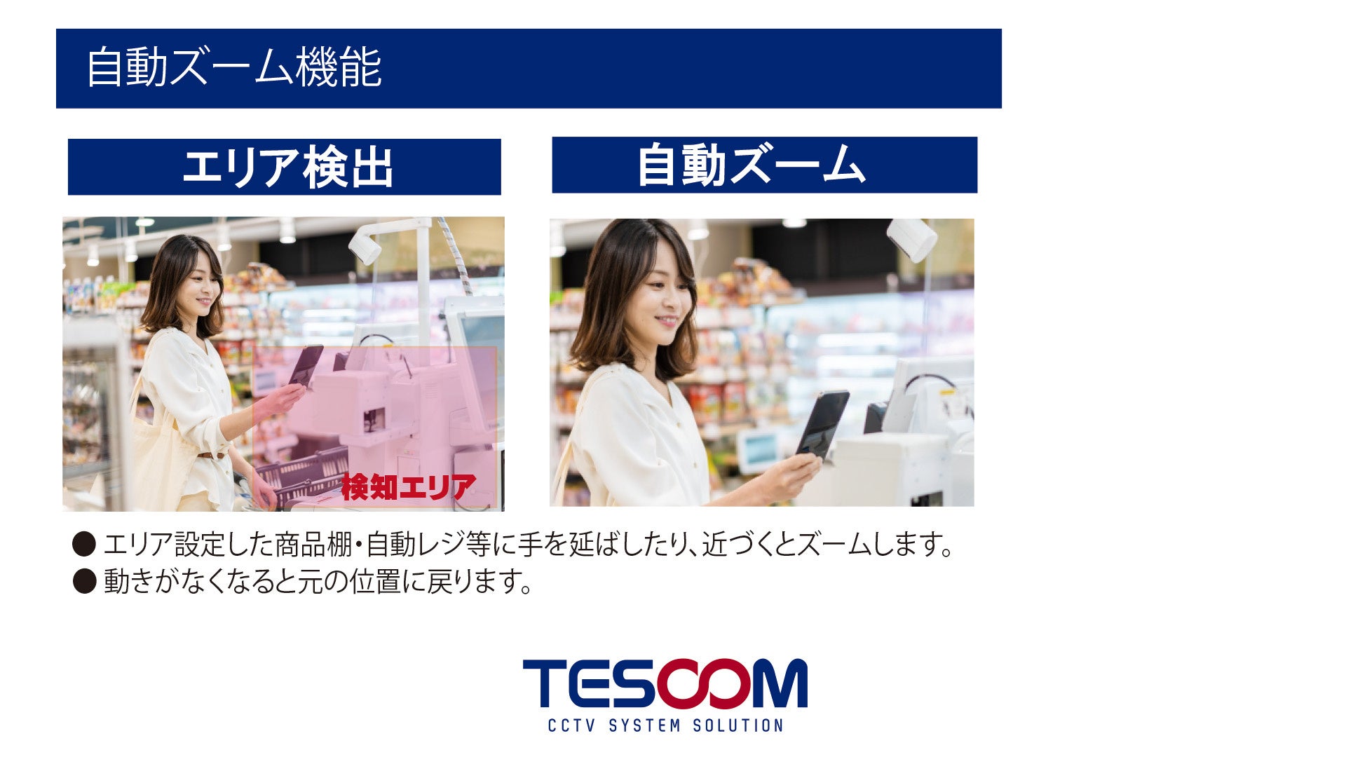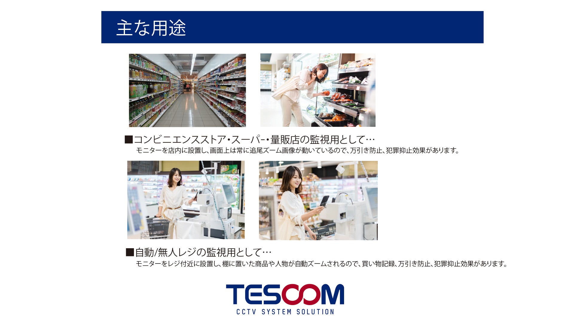 自動レジや、商品棚付近に設置し、エリア内の陳列棚などから商品を手に取った、又は置いた瞬間に、自動追尾とデジタルズームにて拡大、7インチのモニターにより直接映像を確認することにより、視覚的効果が高く、犯罪、万引き防止効果を発揮することが可能です。