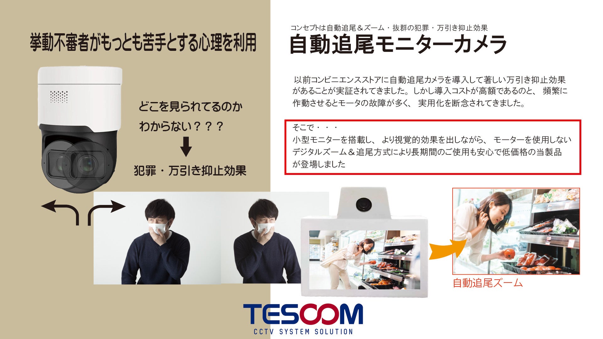 開発コンセプトといたしましては、以前コンビニエンスストアにモーターズーム式の自動追尾を導入して著しい万引きロス率の減少効果があったことを背景に、挙動不審者がもっとも苦手とする心理、すなわち「いつ、どこを見られているかわからない」という点が最も効果的であることをヒントに本製品が開発されました。