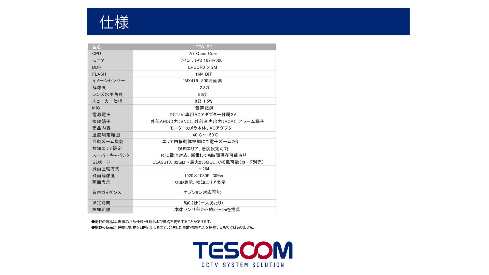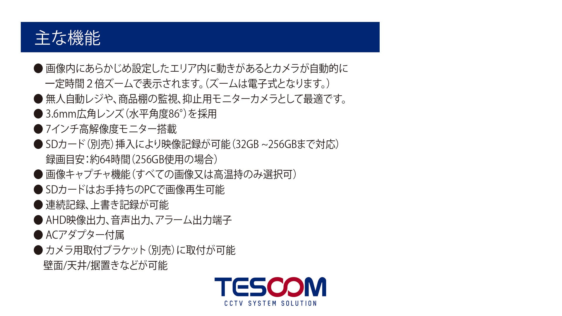 そこで本機は小型モニターを搭載し、より視覚的効果を出しながら、モーターを使用しない、デジタルズーム&追尾方式により、安価で長期間のご使用にも対応する事が可能となりました。