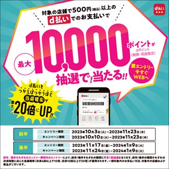 株式会社NTTドコモ(以下、ドコモ)は、「d払い®」加盟店(街のお店、ネットのお店)(※1)において、1回につき500円(税込)以上「d払い」(※2)でお支払いをしたお客さまを対象(※3)に、抽選でdポイント(期間・用途限定)を進呈する「最大10,000ptが当たる!d払い抽選キャンペーン」(以下、本キャンペーン)を2023年10月10日(火)から2024年1月9日(火)までの期間で開催いたします。