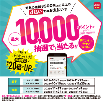 株式会社NTTドコモ(以下、ドコモ)は、「d払い®」加盟店(街のお店、ネットのお店)(※1)において、1回につき500円(税込)以上「d払い」(※2)でお支払いをしたお客さまを対象(※3)に、抽選でdポイント(期間・用途限定)を進呈する「最大10,000ptが当たる!d払い抽選キャンペーン」(以下、本キャンペーン)を2023年10月10日(火)から2024年1月9日(火)までの期間で開催いたします。