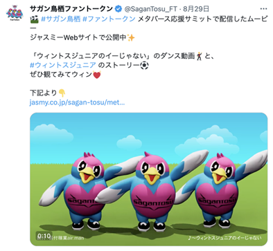 楽曲に合わせて「サガン鳥栖ファントークン」の宣伝担当の3兄弟ウィントス・ジュニアが3Dになって楽しくダンスしている動画が、サガン鳥栖ファントークンX、Youtubeチャンネルで公開され話題になりました。