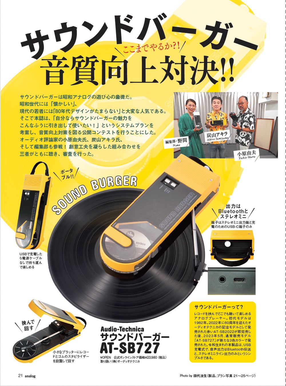 1980年代に一世を風靡した、レコード盤をはさんで鳴らすレコードプレーヤー「サウンドバーガー」。その復刻モデルが、昭和のレトロデザインとアナログの遊び心の象徴として、今大変な人気です。そこで「自分ならサウンドバーガーの魅力をこんなふうに引き出して使いたい!」というシステムプランを考案し、音質向上対策を図る公開コンテストを敢行。オーディオ評論家の小原由夫氏、炭山アキラ氏、そして編集部も参戦し、創意工夫を凝らした組み合わせを三者がともに聴いて採点を行いました。