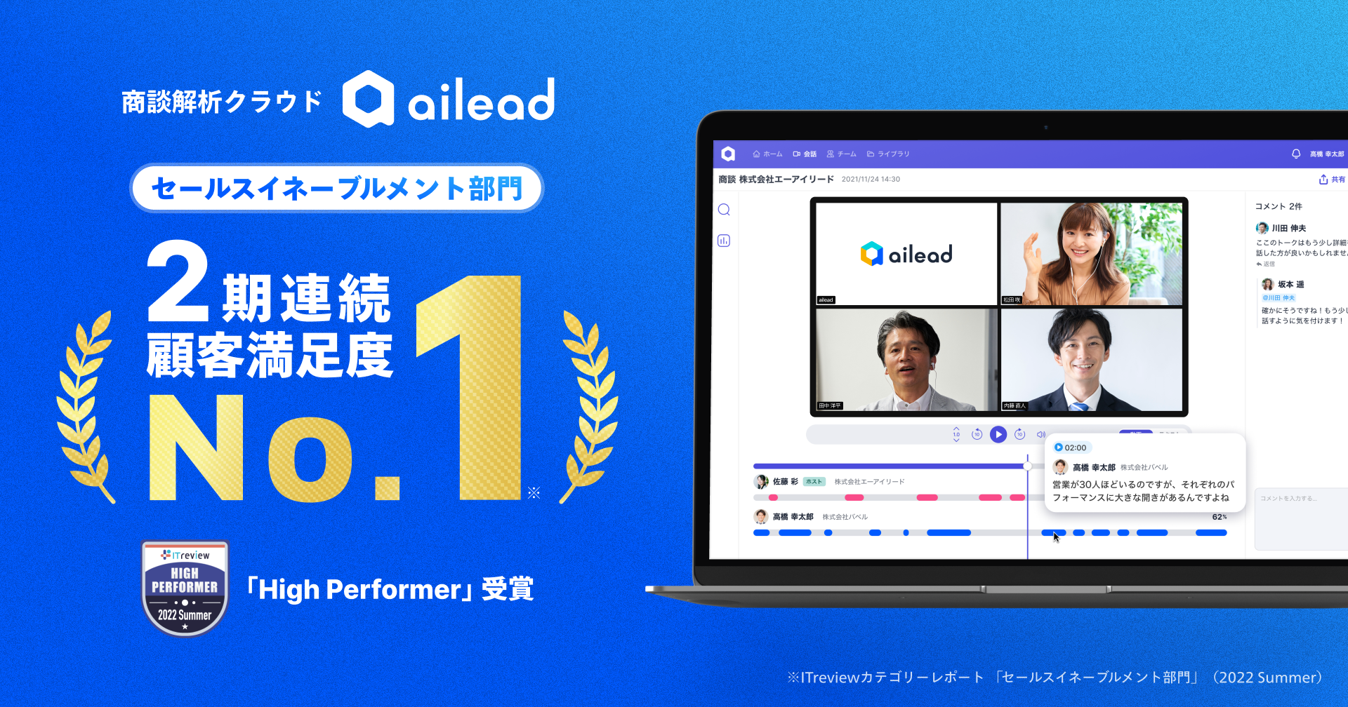 ailead(エーアイリード)は、顧客満足度No.1※の商談解析クラウドです。AIが商談データを自動で収集・解析・可視化することで、営業現場の業務効率化と「売れる」営業人材の育成を実現します。お使いのWeb会議ツールと連携することで、既存の業務フローを全く変えずにご利用いただくことが可能です。様々な業界のセールスイネーブルメントに貢献します。