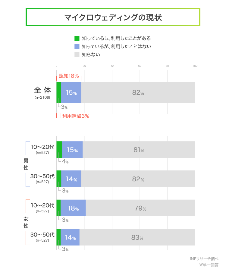ここまでの主な数値をまとめてみました。2022年4月8日時点、「マイクロウェディング」の認知率は約18%、利用経験率は約3%でした。