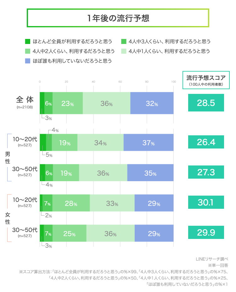 次に「1年後、自分のまわりでどのくらいの人が利用している※と思うか」を想像して答えてもらいました。グラフにある流行予想スコアは、100人中どのくらいの人が1年後に利用していそうかを算出した数値です。