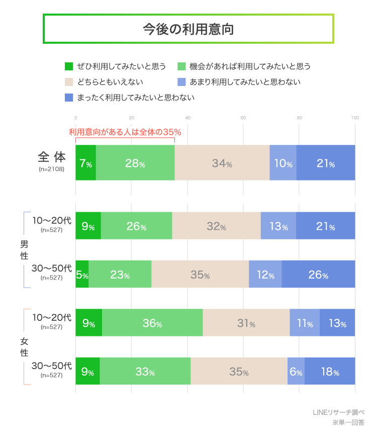 次に、今後の利用の意向※について回答してもらったところ、利用意向がある人の割合(「ぜひ利用してみたいと思う」「機会があれば利用してみたいと思う」の合計)は全体で35%となりました。