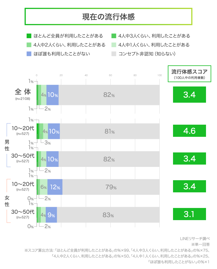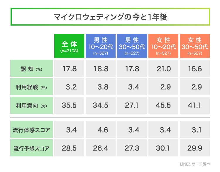 その結果「マイクロウェディング」の流行体感スコアは全体で「3.4」で、およそ100人に3人が利用しているイメージを持たれていることがわかります。