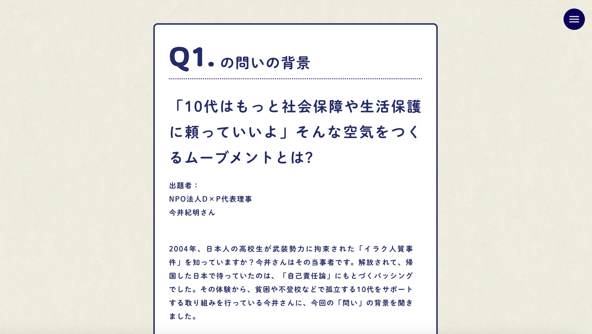 「Q&I」では、「Q:『10代はもっと社会保障や生活に保護に頼っていいよ』そんな空気をつくるムーブメントとは?」「Q: もっと社会が補助犬に『ウェルカム』になるアイデアとは?」など、さまざまな生きた問いを紹介しています。