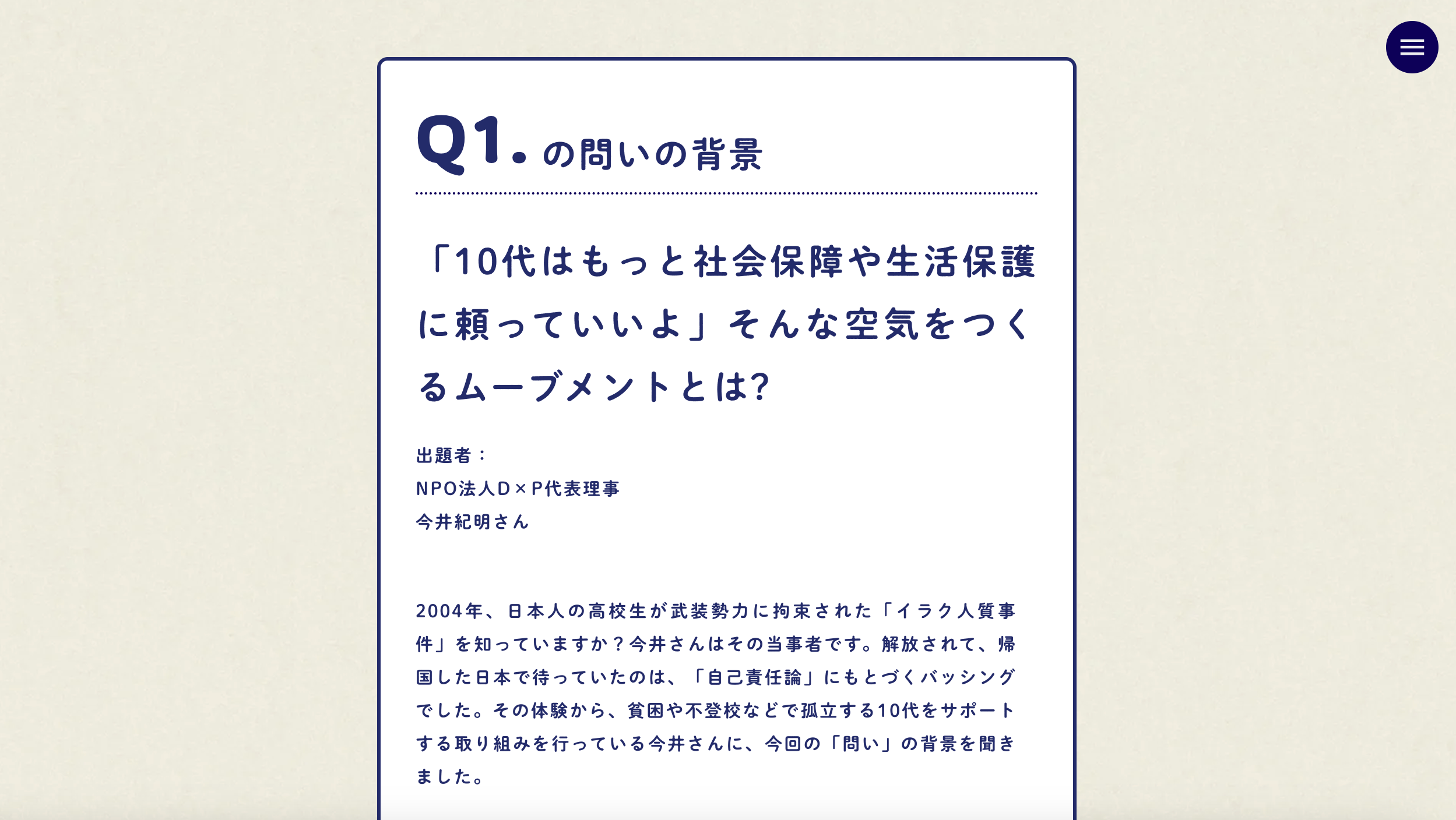 「Q&I」では、「Q:『10代はもっと社会保障や生活に保護に頼っていいよ』そんな空気をつくるムーブメントとは?」「Q: もっと社会が補助犬に『ウェルカム』になるアイデアとは?」など、さまざまな生きた問いを紹介しています。