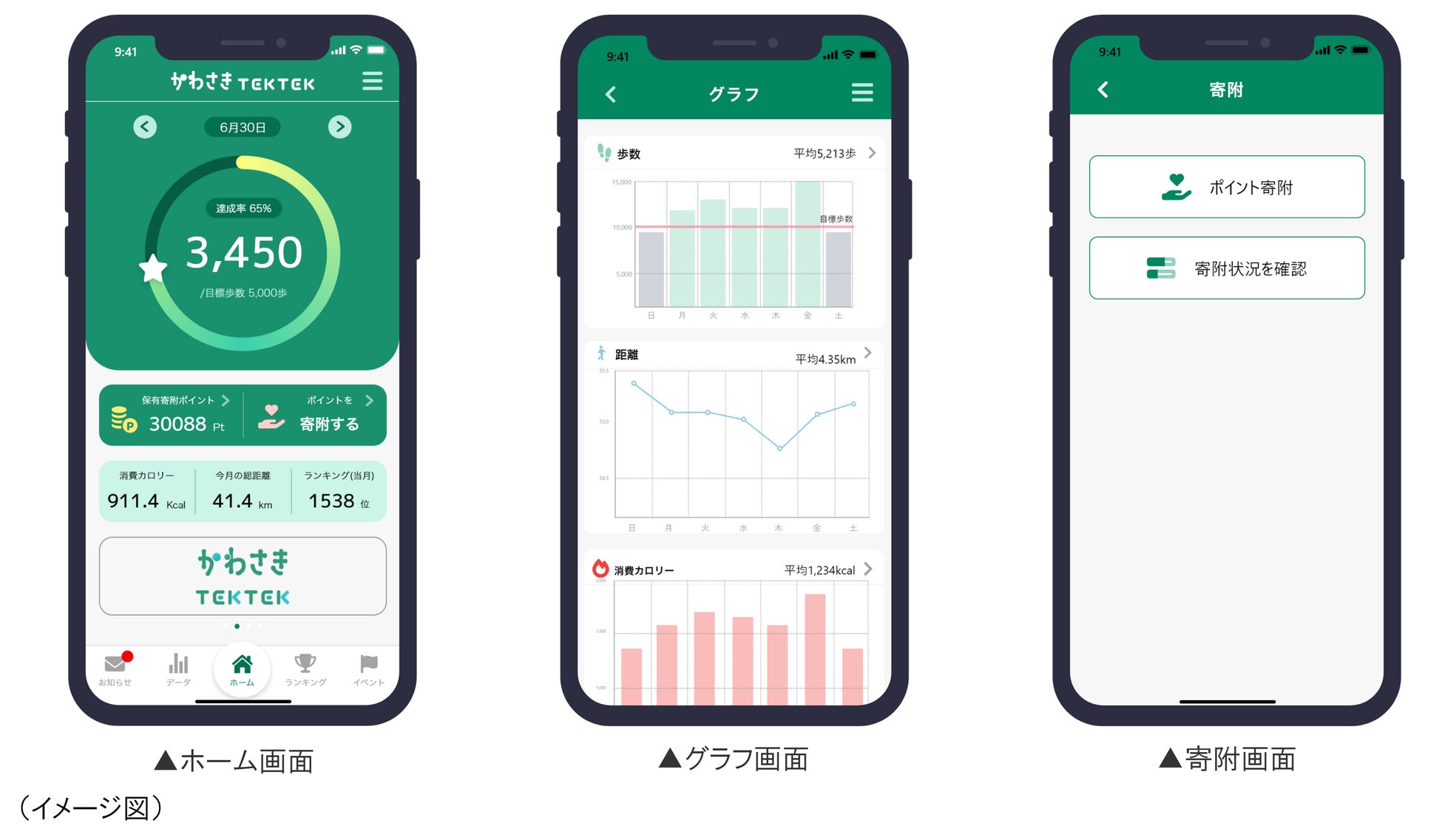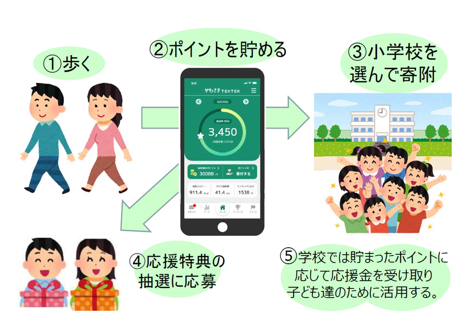「かわさきTEKTEK」は、スマートフォンアプリをダウンロードし、スマートフォンを持ち歩くと、歩数に応じてポイントが付与される健康づくり支援アプリです。そのほか、ポイントはウォーキングコースやスタンプラリーの制覇などでも付与される予定です。貯めたポイントは、小学校を選択して寄附することができ、さらに寄附したポイント数に応じて抽選への応募チケットが付与され、協賛企業からの提供商品やさまざまな体験ができる権利やチケットなどが当たる抽選に応募することができます。