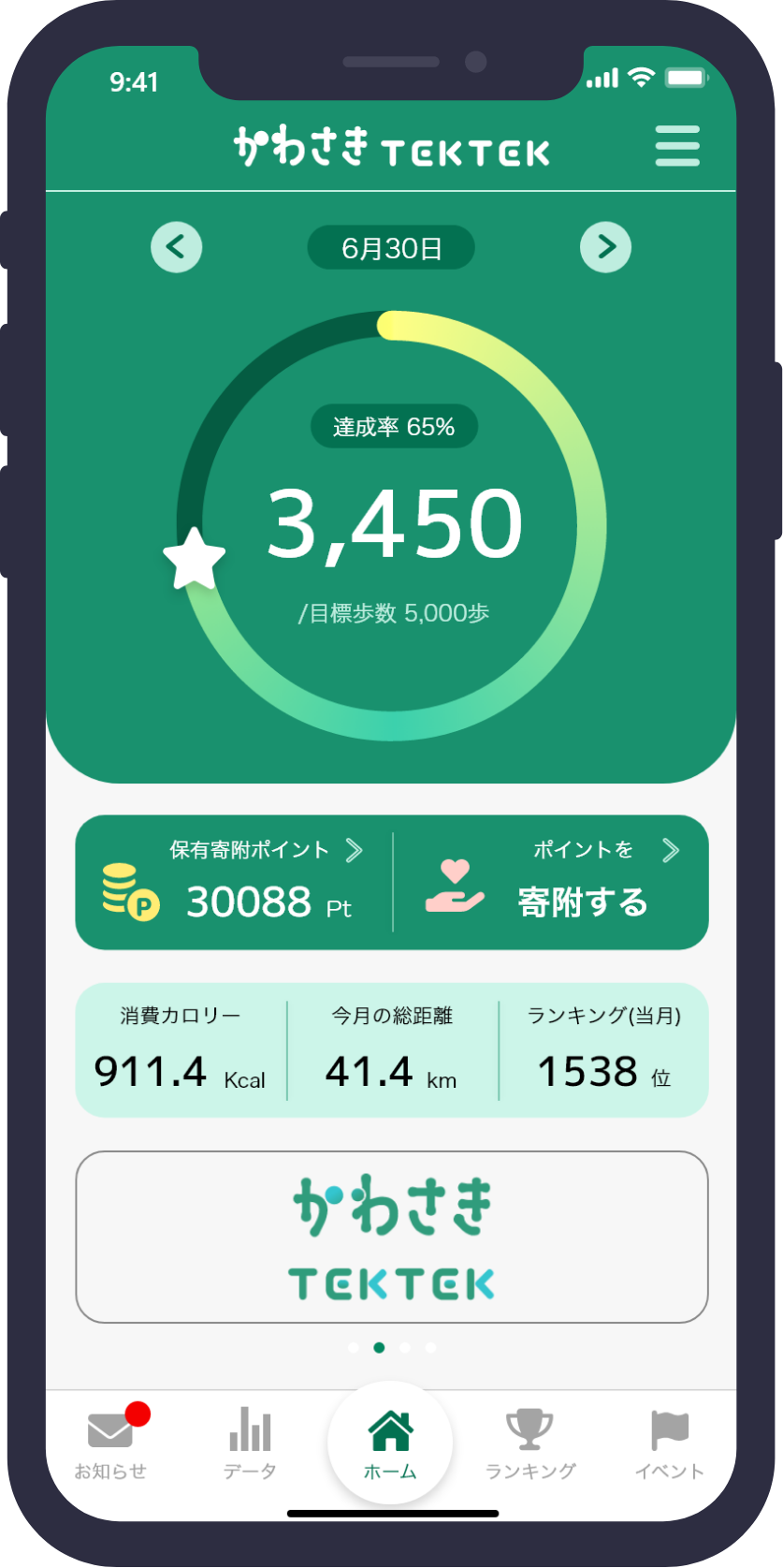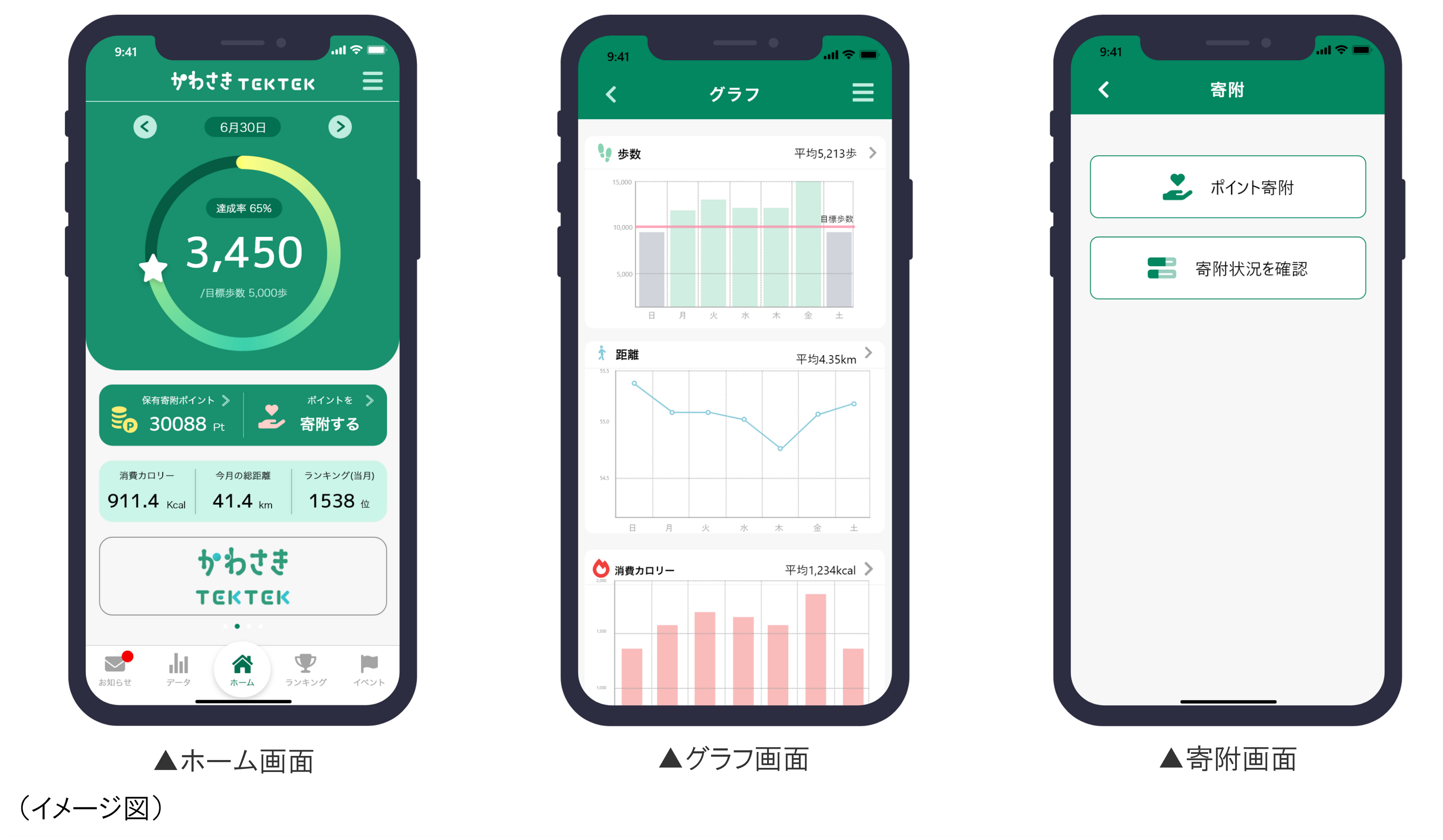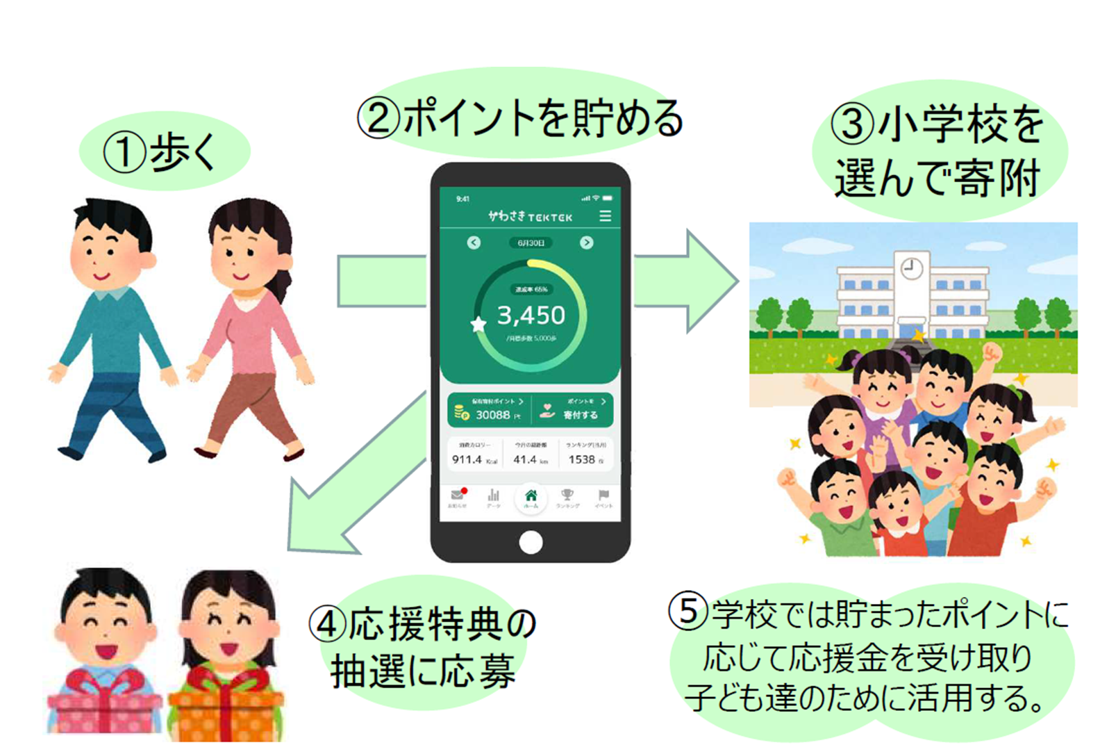 「かわさきTEKTEK」は、スマートフォンアプリをダウンロードし、スマートフォンを持ち歩くと、歩数に応じてポイントが付与される健康づくり支援アプリです。そのほか、ポイントはウォーキングコースやスタンプラリーの制覇などでも付与される予定です。貯めたポイントは、小学校を選択して寄附することができ、さらに寄附したポイント数に応じて抽選への応募チケットが付与され、協賛企業からの提供商品やさまざまな体験ができる権利やチケットなどが当たる抽選に応募することができます。