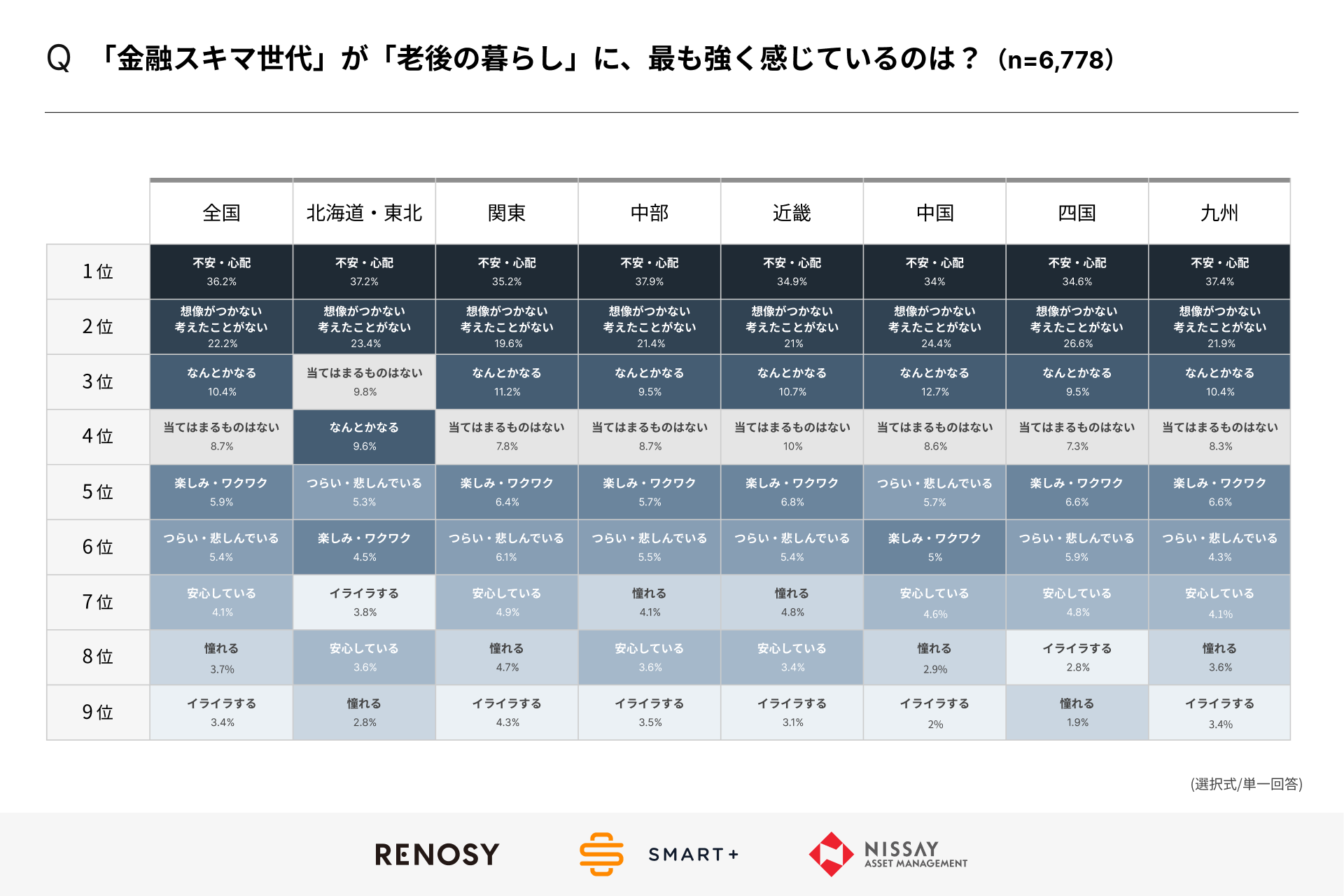 「老後の自分の暮らしを想像したときに、思い当たる感情で最も強く思うもの」を尋ねました。全国平均、各地方別ともに30%以上が「不安・心配」への回答する割合が最も高く、3人に1人が不安を感じていることが分かりました。次に回答の多かったものは、全国平均・各地方別とも「想像がつかない・考えたことがない」となりました。
